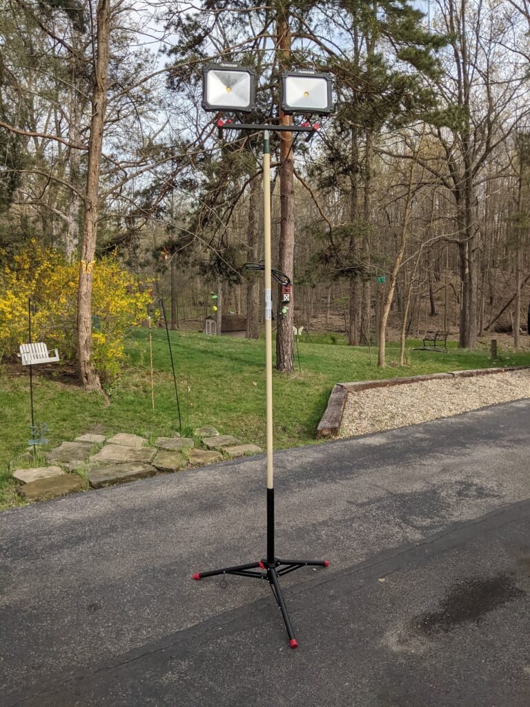 Part of my task also involved getting some sort of lighting so that we can see who gets blasted to the moon in their knocker-ball deep into the night. The lights needed to be pretty high off the ground and out of people’s eyes, so a standard work light tripod wouldn’t do the trick. We also really didn’t want to spend a ton of money to rent some lights just for an evening. We had someone build some tall light posts out of 2x4s a few years back, but those mysteriously vanished.